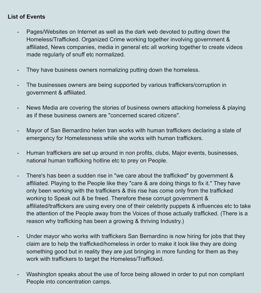 •Homeless are targeted by various. Traffickers, rapists, and the traffickers/rapists etc speaking of are often politicians, rich in money, non profis etc So the Homeless can not speak up about the abuse they endure.