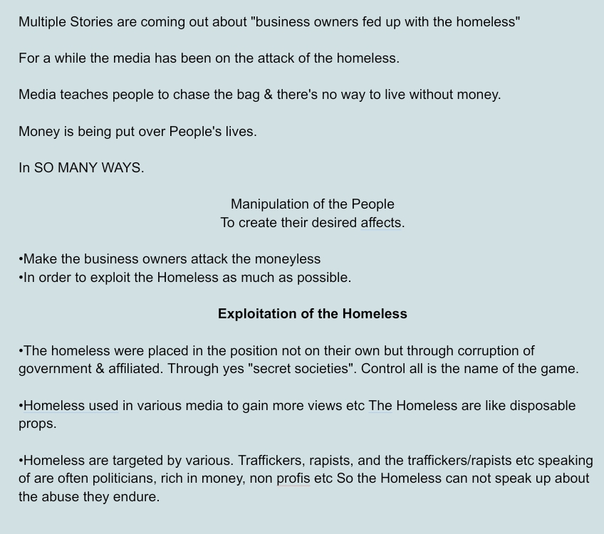 •The homeless were placed in the position not on their own but through corruption of government & affiliated. Through yes “secret societies”. Control all is the name of the game.